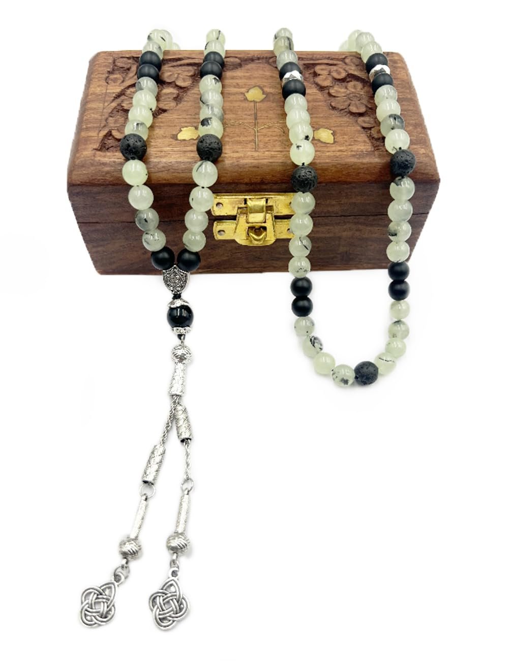 Crystal Souq Natural Prehnite Stone 99-Bead Tasbih (8mm) – Healer’s Gemstone Misbaha with Wooden Gift Box