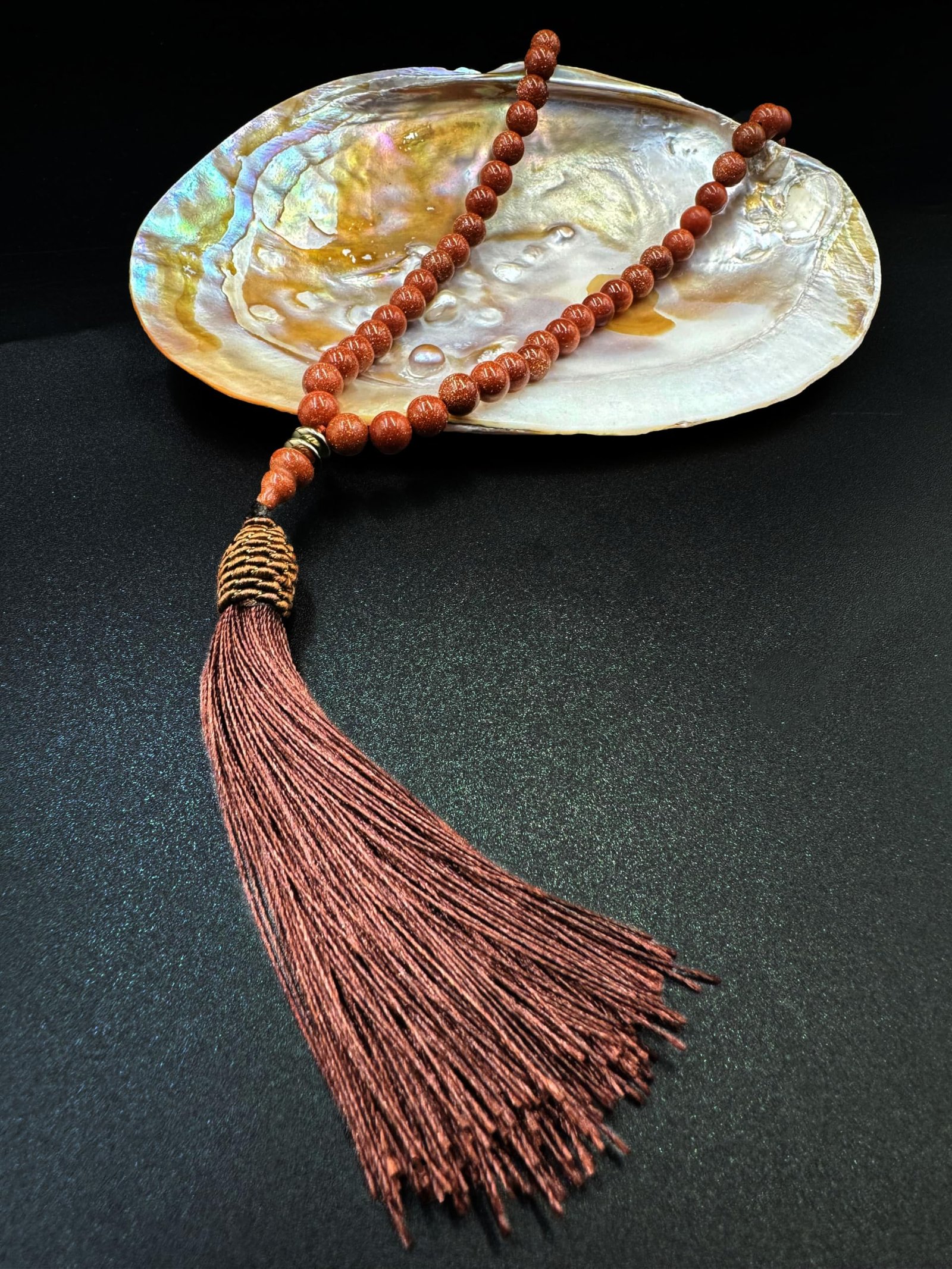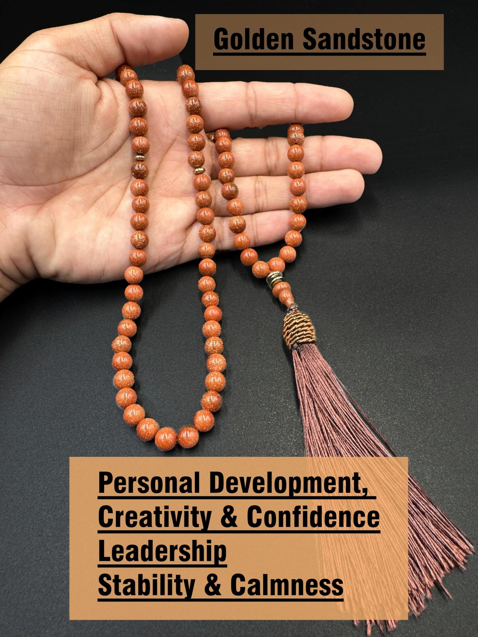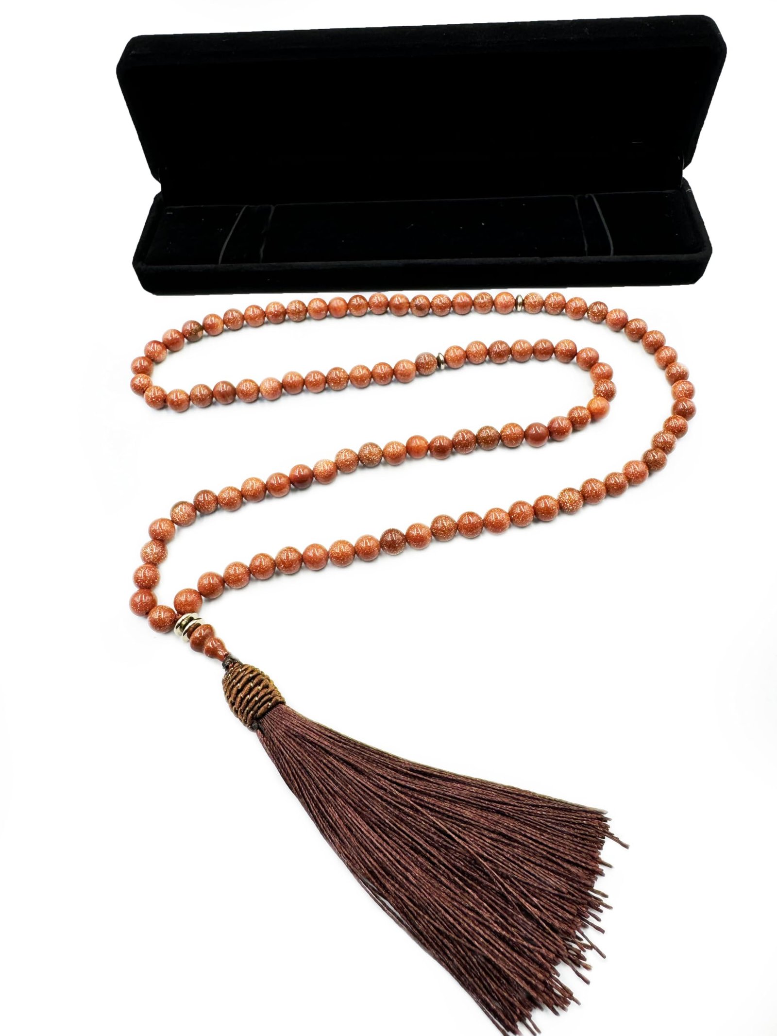 Natural Goldstone Tasbih / Tasbeeh / Misbaha / The message of the Goldstone crystal stone meaning is that sometimes you have to lose your mind to find yourself. A protective warrior stone, the Goldstone crystal helps you get out of your head and back down to earth.