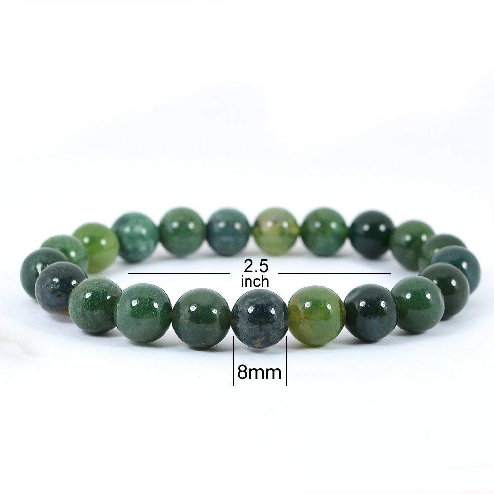 - Bracelet Size: A beautiful bracelet crafted from Natural Moss Agate crystals. 8 mm thick beads on a stretchable bracelet, fits most wrists, both Men & Women, About 7 to 7.5 inch in size. If you require the same bracelet in any particular size, you can message us for customization also.