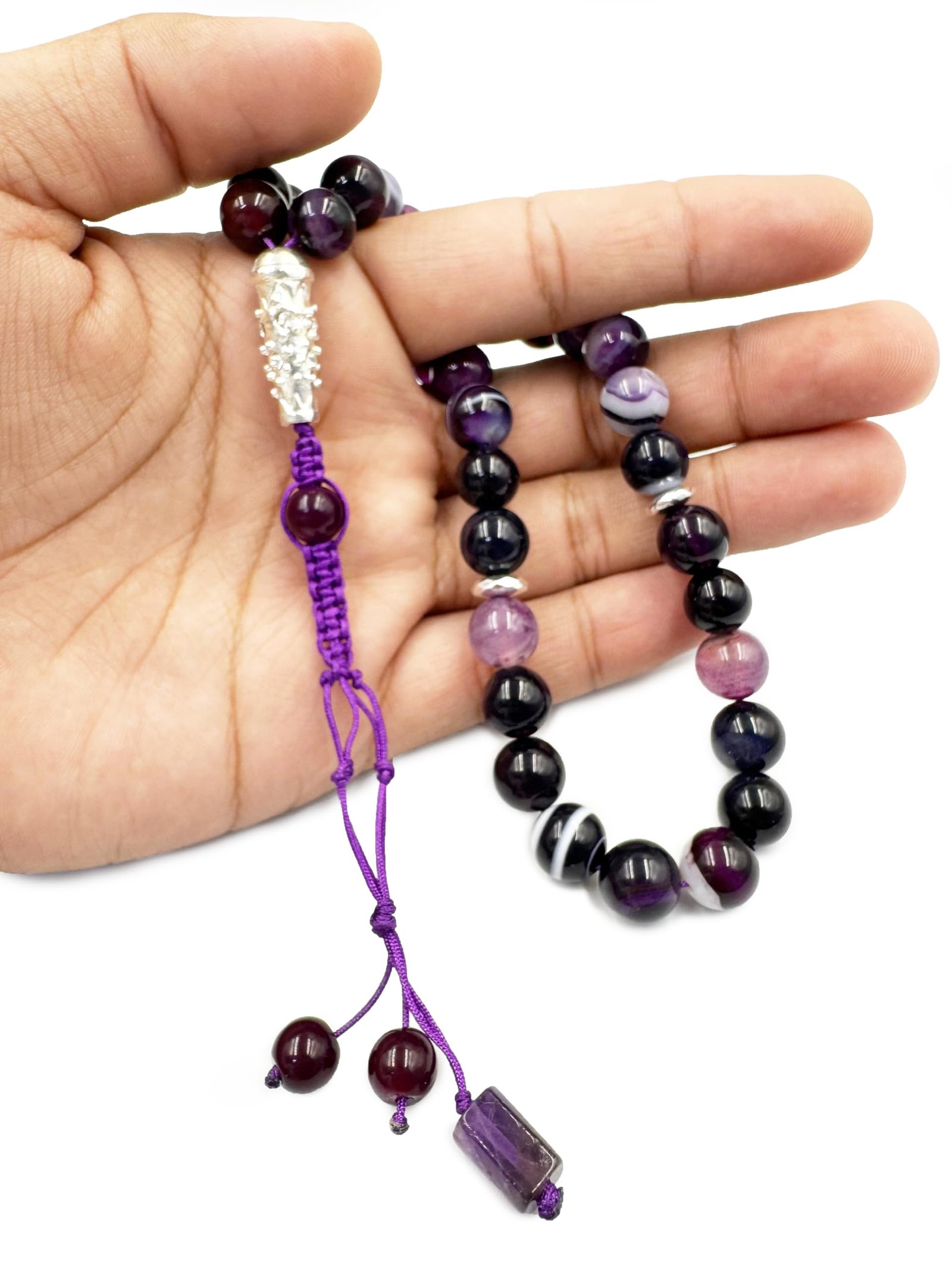 The REBUY Natural Gemstone Islamic Prayer Tasbih is a stunning piece handcrafted from 33 Purple Stripe Agate beads, known for their calming, protective, and spiritually enriching qualities. With each bead meticulously sized at 8mm, this tasbih is designed for ease of use during Islamic prayer, Dhikr, meditation, or mindfulness practices. The tasbih comes in a beautifully crafted wooden gift box, making it a thoughtful present for special occasions like Ramadan, Eid, or personal milestones. Whether you are looking to enhance focus and serenity or find a unique spiritual gift, this handcrafted tasbih offers a perfect balance of beauty, functionality, and meaning. Product Highlights: 1. Crafted from natural Purple Stripe Agate gemstone beads. 2. 33 beads designed for Islamic prayer and meditation. 3. Enhances mental clarity, focus, and emotional balance. 4. Comfortable 8mm bead size for easy handling. 5. Handcrafted with durable and high-quality stringing. 6. Includes a beautifully crafted wooden gift box. 7. Ideal for meditation, Dhikr, and mindfulness practices. 8. Compact, portable, and perfect for daily spiritual practice. 9. Thoughtful gift for spiritual occasions like Ramadan and Eid. 10. Suitable for both men and women, elegant design. Product Features: 1. Natural Purple Stripe Agate Beads – Made from high-quality gemstone that supports emotional and spiritual balance. 2. 33 Beads Design – Ideal for use during prayer, meditation, and Dhikr. 3. Comfortable 8mm Bead Size – Ensures a smooth, tactile experience for users. 4. Handcrafted with Care – Each tasbih is crafted with precision for durability and longevity. 5. Elegant Wooden Gift Box – Comes in a beautifully designed box, perfect for gifting or safekeeping. 6. Enhances Focus & Serenity – Promotes mental clarity and emotional grounding. 7. Durable Stringing – High-quality string ensures lasting use without wear. 8. Portable for On-the-Go Use – Easily fits in a pocket or bag, perfect for travel. 9. Versatile Spiritual Tool – Suitable for various spiritual practices, including meditation and Dhikr. 10. Unisex Design – Ideal for both men and women, suitable for all ages.