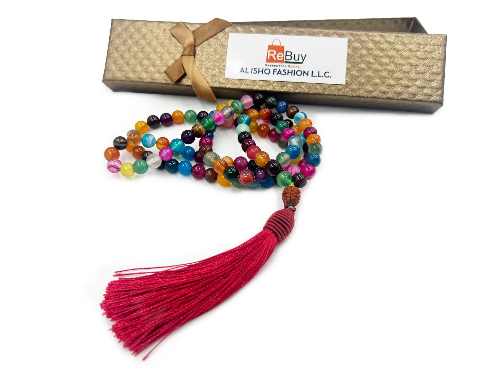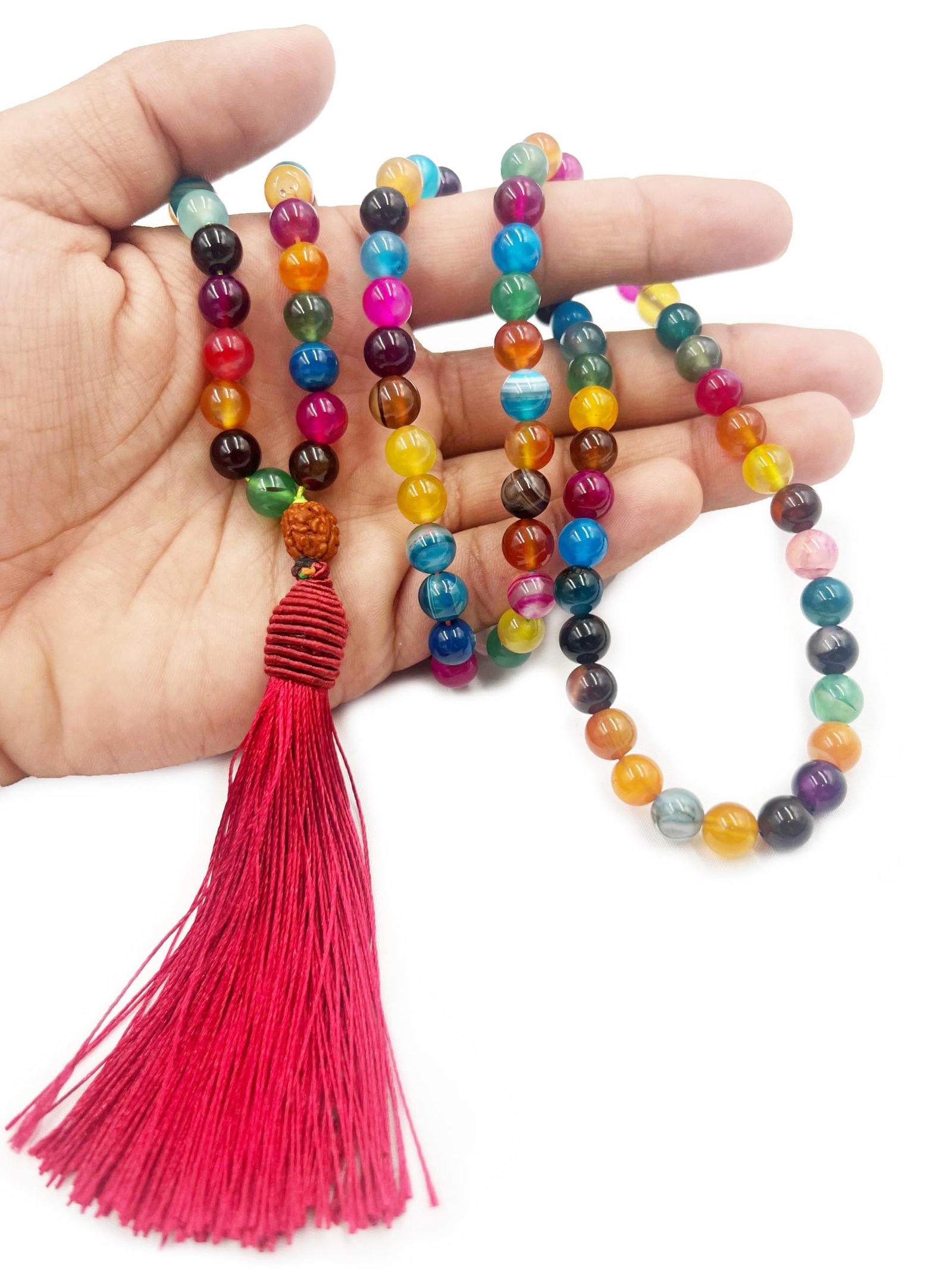 Harmonize your energy and embrace new beginnings with this vibrant Multi-Color Agate Mala. Handcrafted with 108 natural 8mm beads, this necklace is a powerful tool for centering physical energy, healing inner anger, and fostering love. Its colorful “Boho” style makes it a beautiful accessory for peace, serenity, and positive vibes.