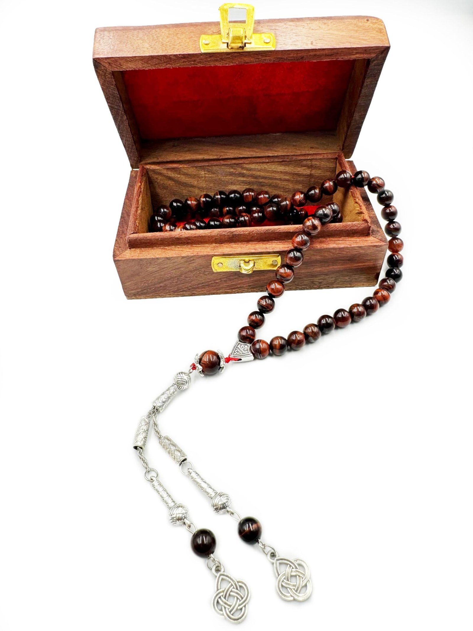 Red Tiger Eye Stone Islamic Muslim 99 Prayer Beads, Tesbih, Tasbih, Tasbeeh, Misbaha, Rosary, Worry Beads, Red Tigers Eye, Bead Size 8 mm, Wooden Gift Box