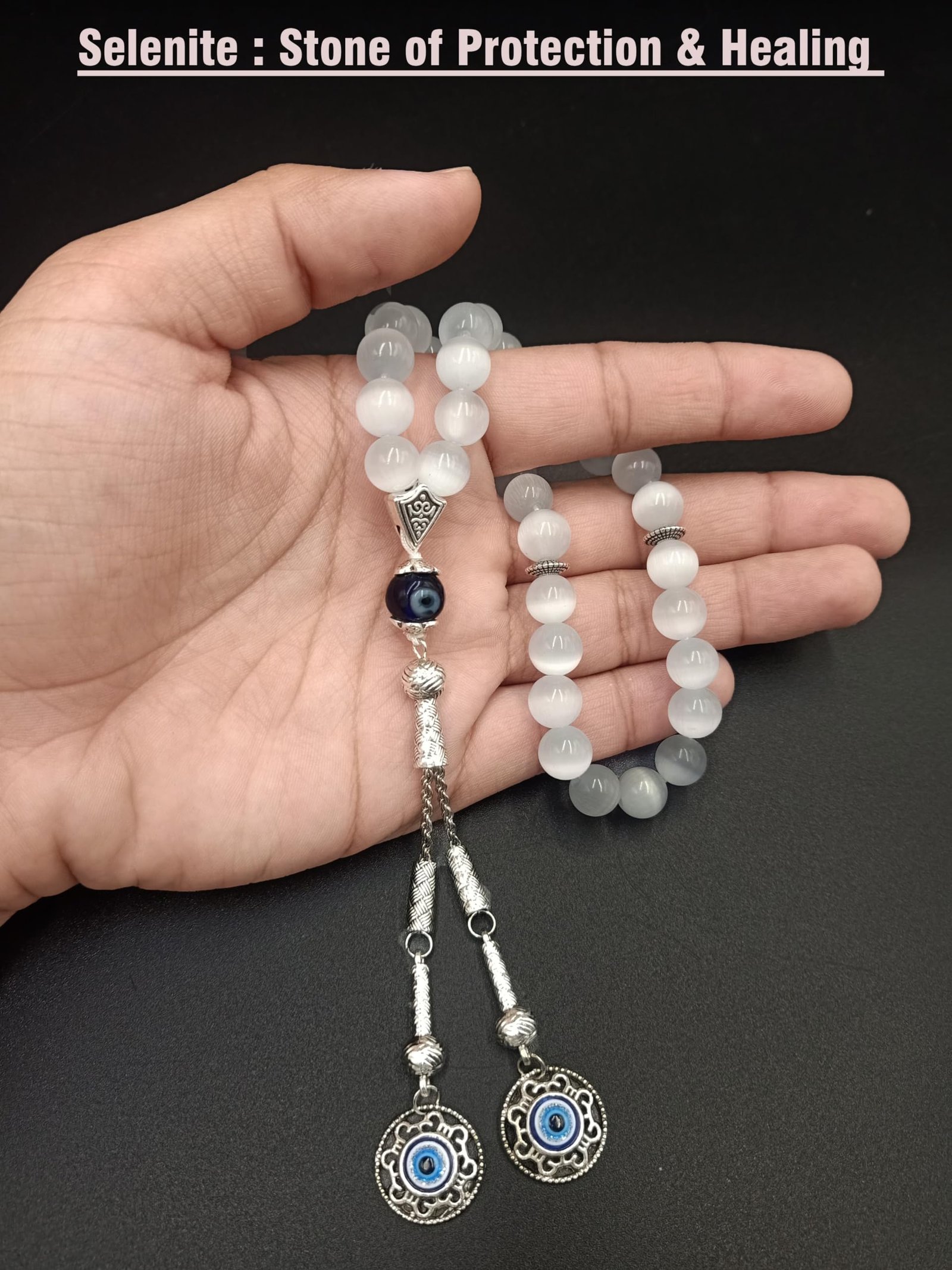 Natural Selenite With Evil Eye Charm Beads Tasbeeh Misbaha