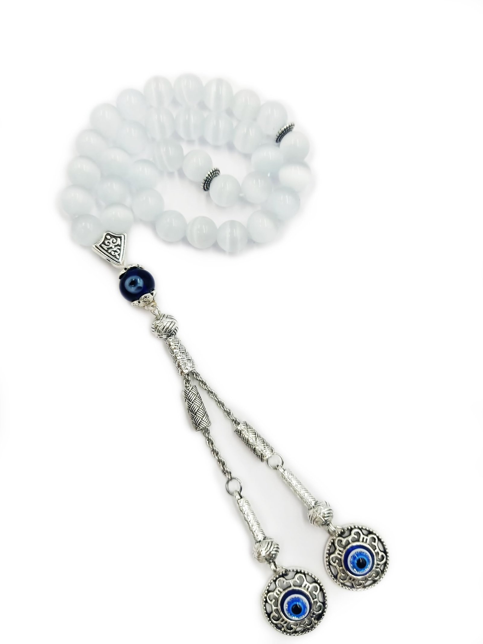 - PRODUCT DETAILS : Stone – Selenite Tasbih with Evil Eye | Color: White | No.of Beads : 33 | Pack of 1