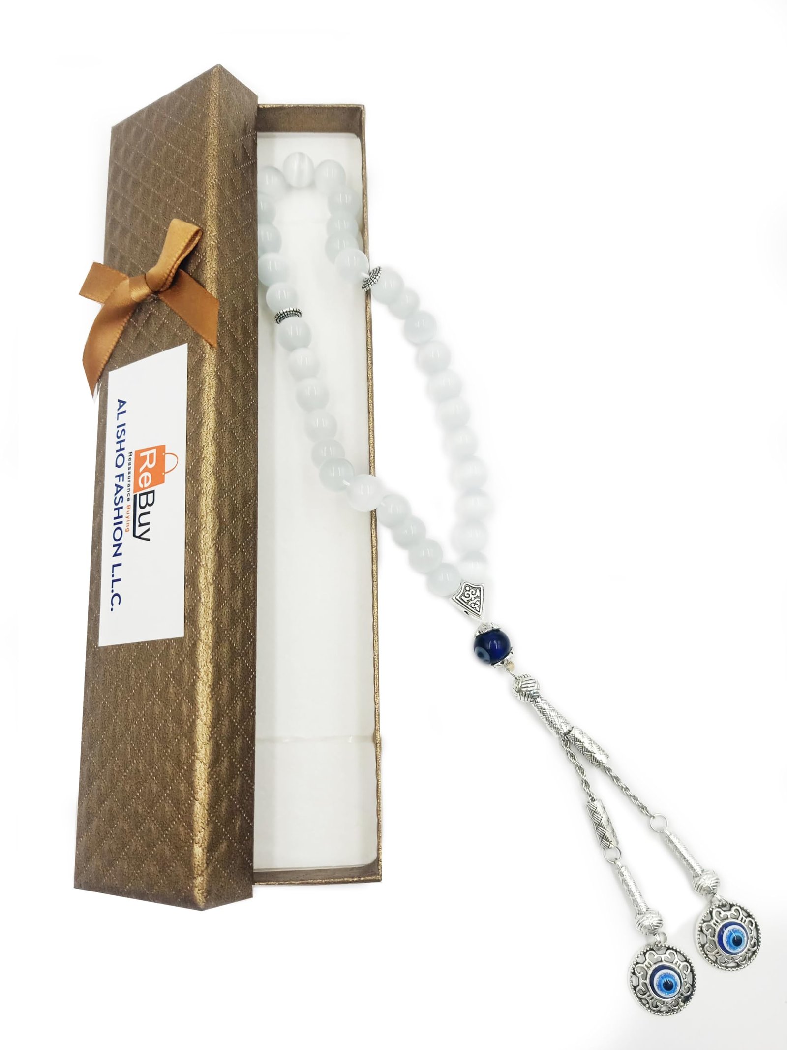 - UNIQUE DESIGN WITH EVIL EYE CHARM: The REBUY Islamic Prayer Selenite Tasbih stands out with its exceptional design, accentuated by the presence of an intricately detailed evil eye charm. This combination of natural selenite stone beads and the protective charm adds a touch of uniqueness to this tasbih, making it an excellent choice for both personal use and gifting.